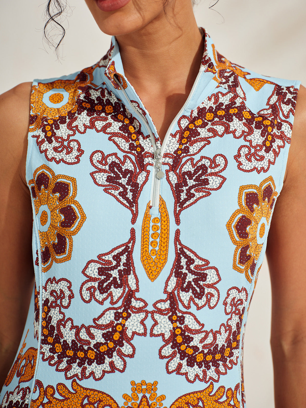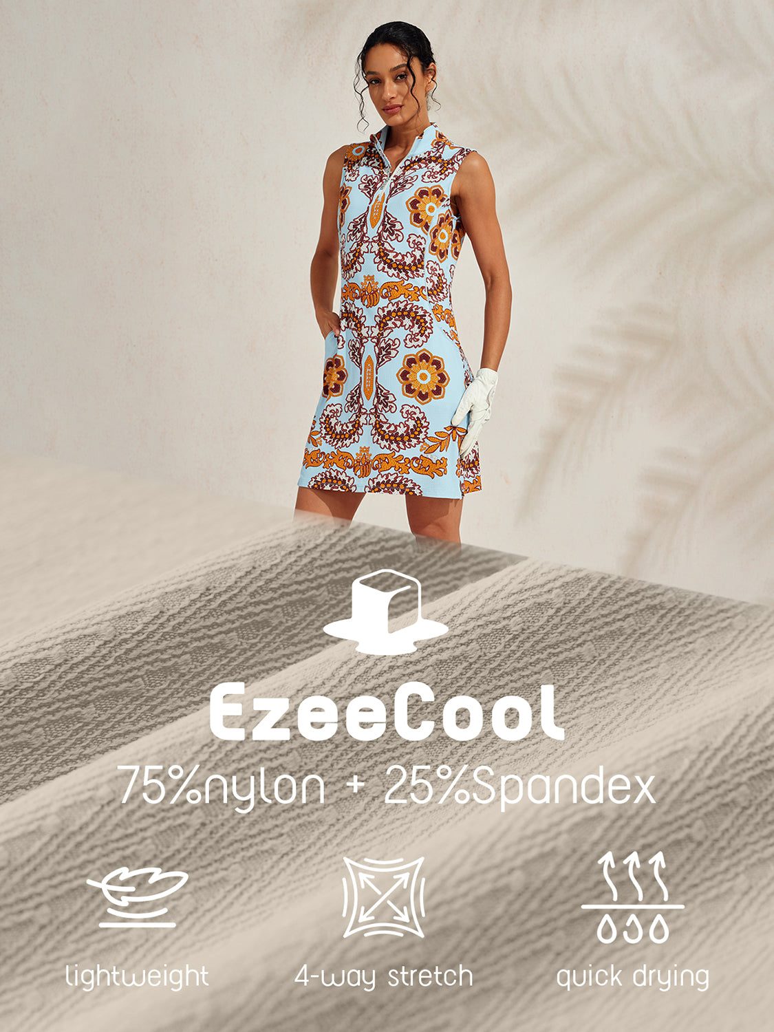 Aus unserer Premium-Kollektion, gefertigt aus unserem eigens entwickelten Ezeecool™-Gewebe. Das Musterdesign zieht Inspiration durch Pailletten`, kunstvoll zu filigranen Blumenmustern arrangiert, die Farben und Texturen miteinander verschmelzen lassen. Dieses Kleid ist mit einem ` diamantbesetzter Reißverschluss mit hautfreundlichem Reißverschlussschutz, geschwungene Nähte, Besatz und Mesh-Seitenschlitze schmeichelt Ihrer Figur und kombiniert Stil und Performance perfekt für einen modernen Golf-Look.