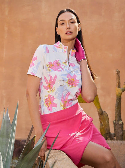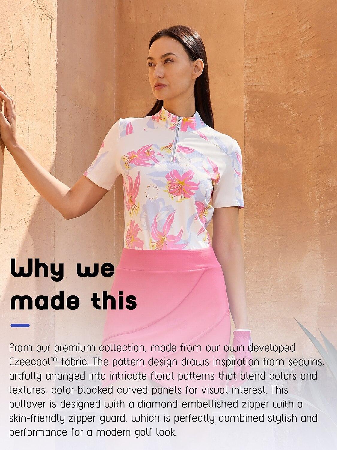 Aus unserer Premium-Kollektion, gefertigt aus unserem eigens entwickelten Ezeecool™-Gewebe. Das Musterdesign zieht Inspiration durch Pailletten, kunstvoll zu filigranen Blumenmustern arrangiert, in denen Farben und Texturen miteinander verschmelzen, Farblich abgesetzte, gebogene Paneele für optische Akzente. Dieser Pullover ist mit einem diamantbesetzter Reißverschluss mit einem hautfreundlichen Reißverschlussschutz, der Stil und Performance perfekt kombiniert und so einen modernen Golf-Look schafft.