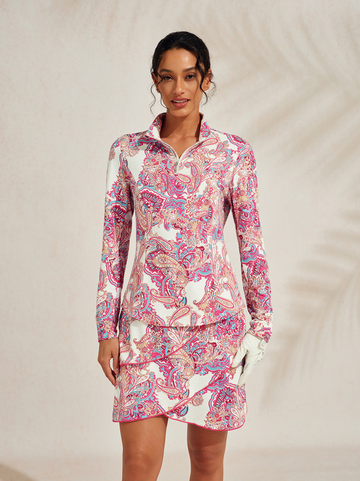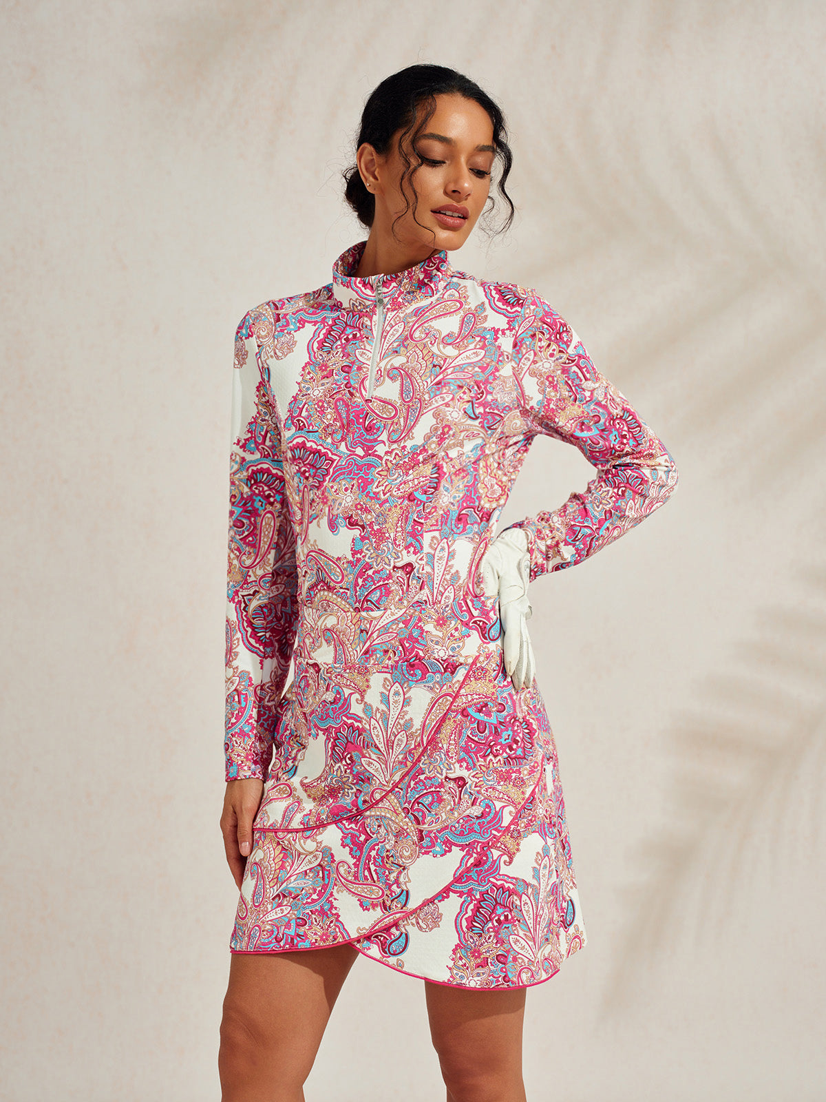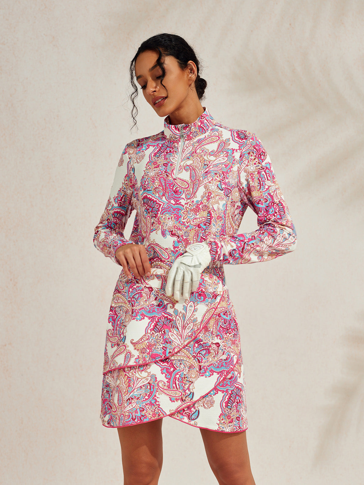 De nuestra colección premium, confeccionada con nuestra propia tela desarrollada Ezeecool™. El diseño del patrón atrae inspiración de lentejuelas, artísticamente dispuesto en intrincados patrones florales que combinan colores y texturas, reflejando la delicada belleza de las flores reales. Este suéter está diseñado con una cremallera adornada con diamantes y una protección para la cremallera amigable con la piel, además de un diseño de malla en las axilas que promueve mayor comodidad y transpirabilidad, lo cual es lujo combinado y funcionalidad y adecuado para muchas situaciones de la vida, tanto dentro como fuera del campo de golf.