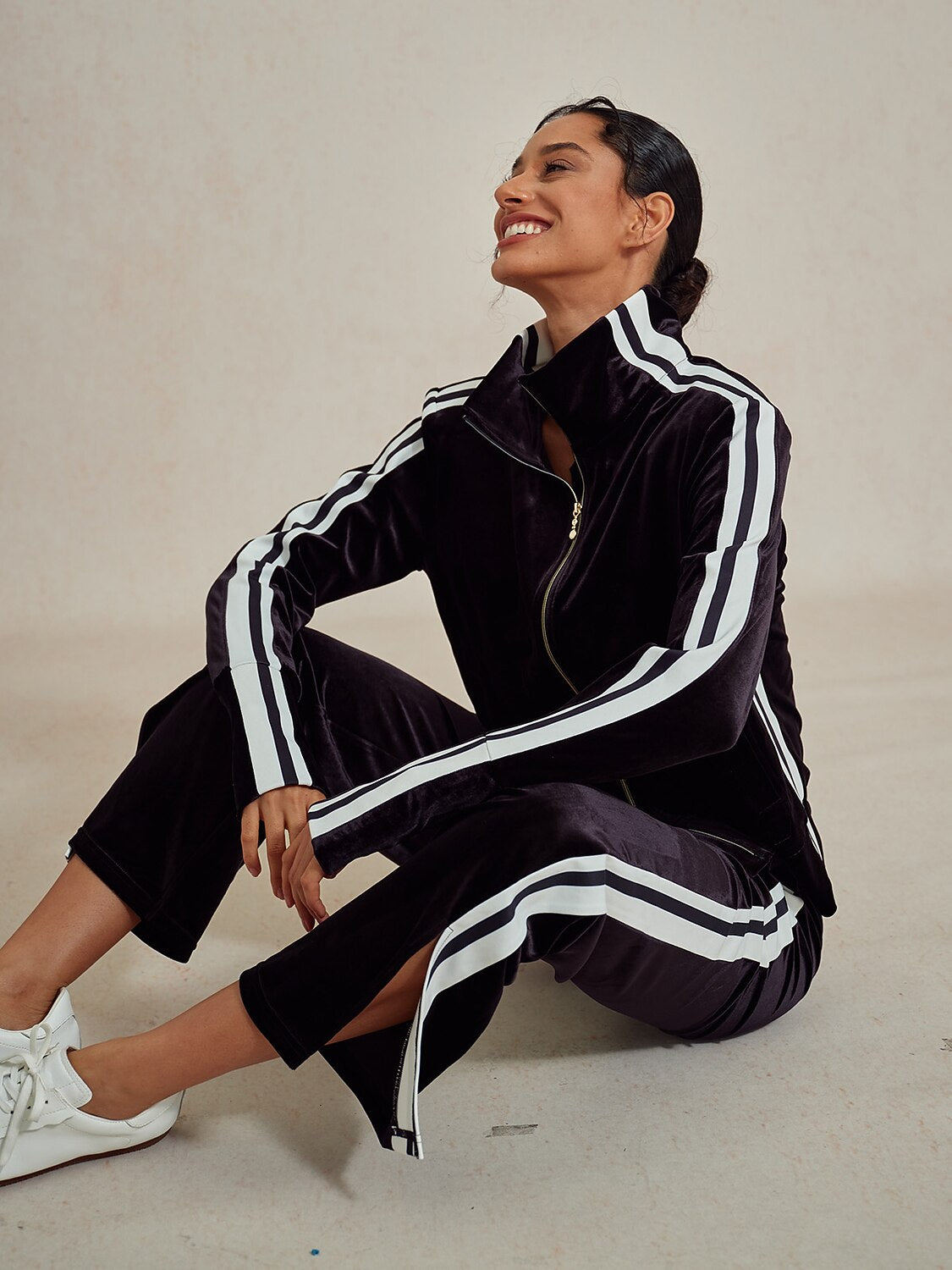 De nuestra colección UltraSoft. Esta chaqueta de golf de terciopelo combina perfectamente lujo y practicidad. Terciopelo elástico crea una silueta fluida, mientras que una cremallera metálica de dos vías y las rayas contrastantes añaden un toque de elegancia deportiva. Los puños con abertura para el pulgar proporcionan protección solar y calidez. Ya sea que estés en el campo o descansando en el club, esta chaqueta irradia sofisticación.