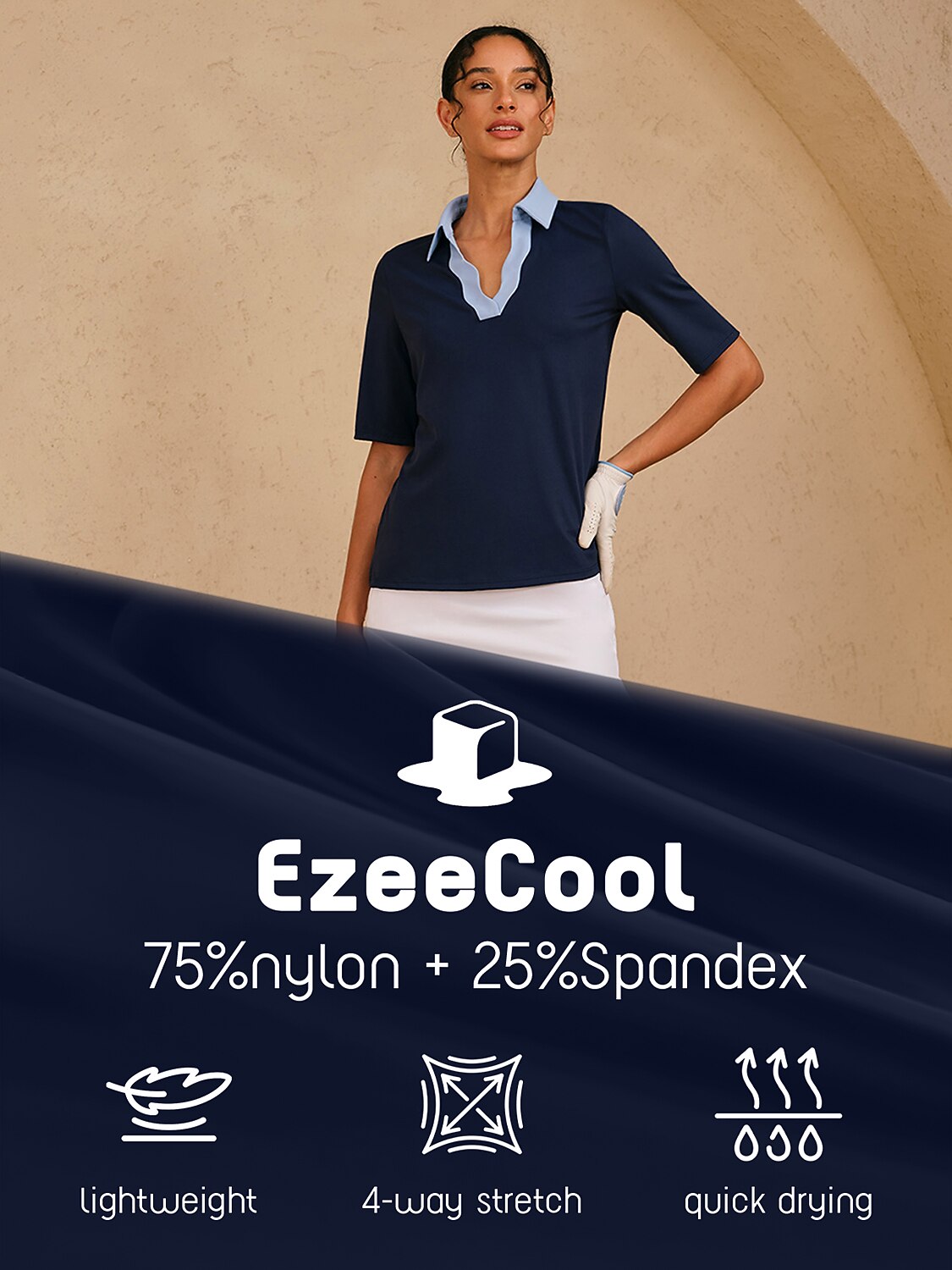 EzeeCool™ est un tissu en nylon haute performance amélioré avec du spandex pour une facilité et un confort ultimes. Ce matériau auto-refroidissant résiste aux plis et est facile à entretenir, garantissant un aspect net et soigné avec un minimum d'effort. Son toucher frais et soyeux le rend parfait pour l'été, évacuant l'humidité pour vous garder au sec et au frais pour toute activité.