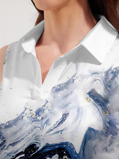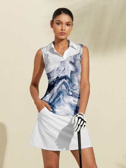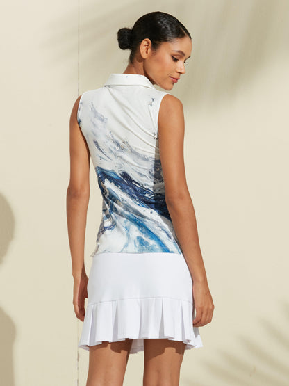 Love the splash of blues. Looks great with navy or white skort. A little long for my short torso but looks nice tucked in as well.