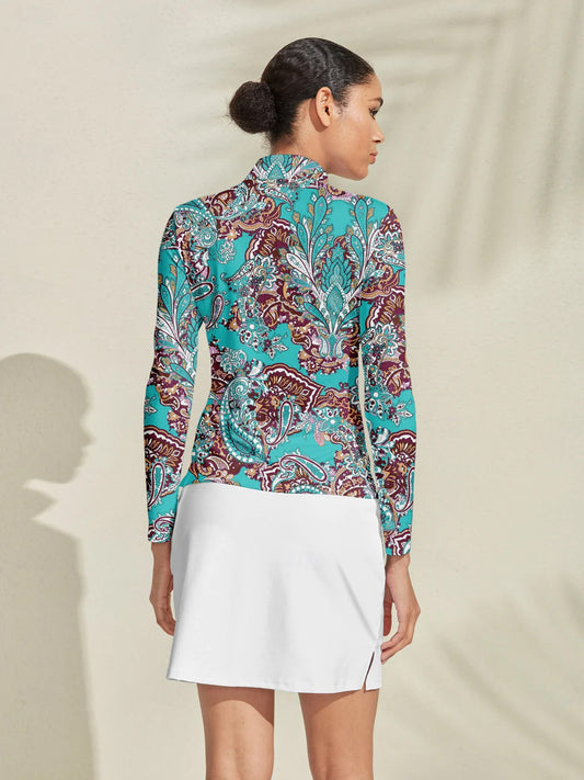 Elegante polo da golf femminile in seta con mezza zip UPF50+