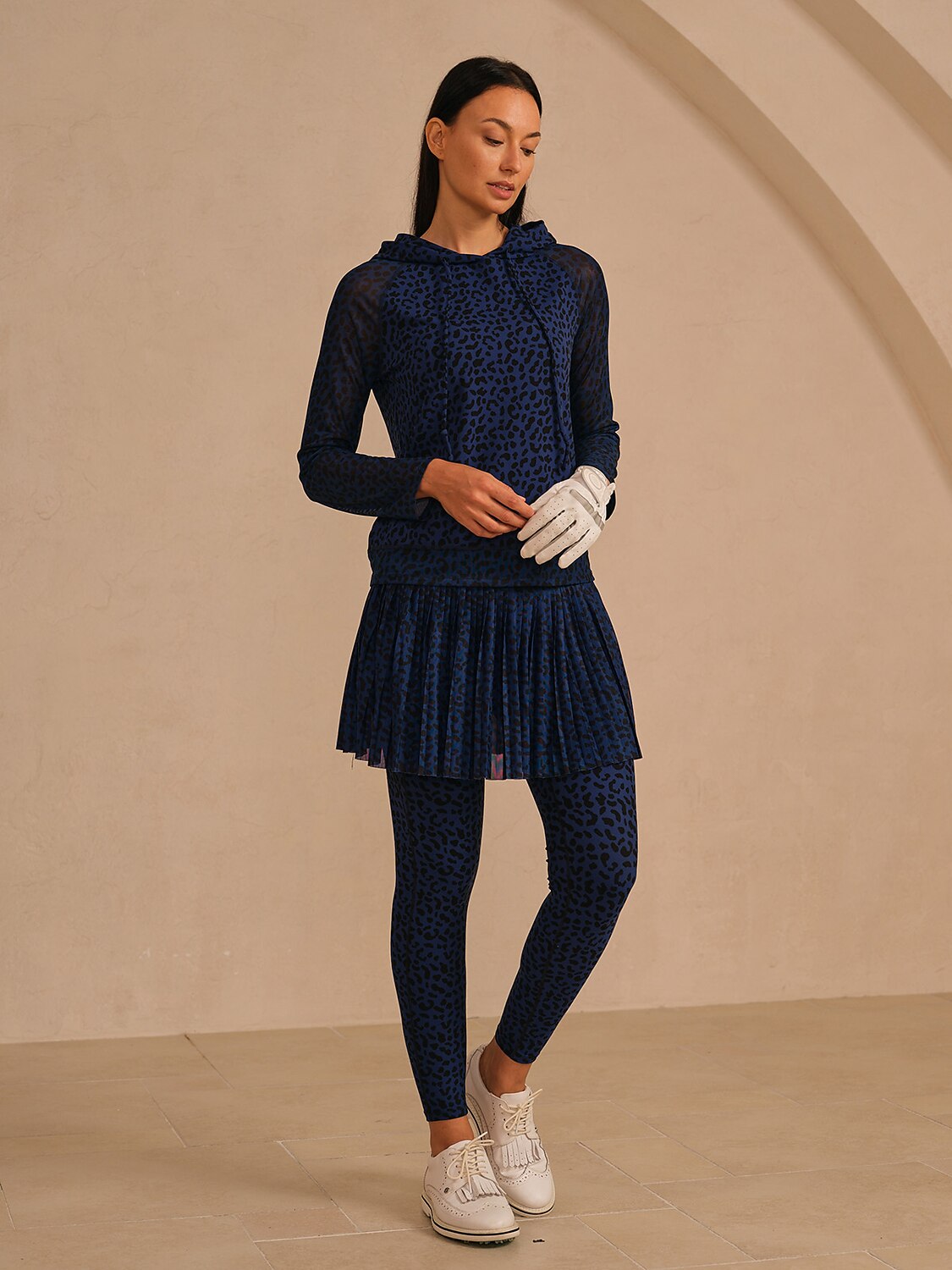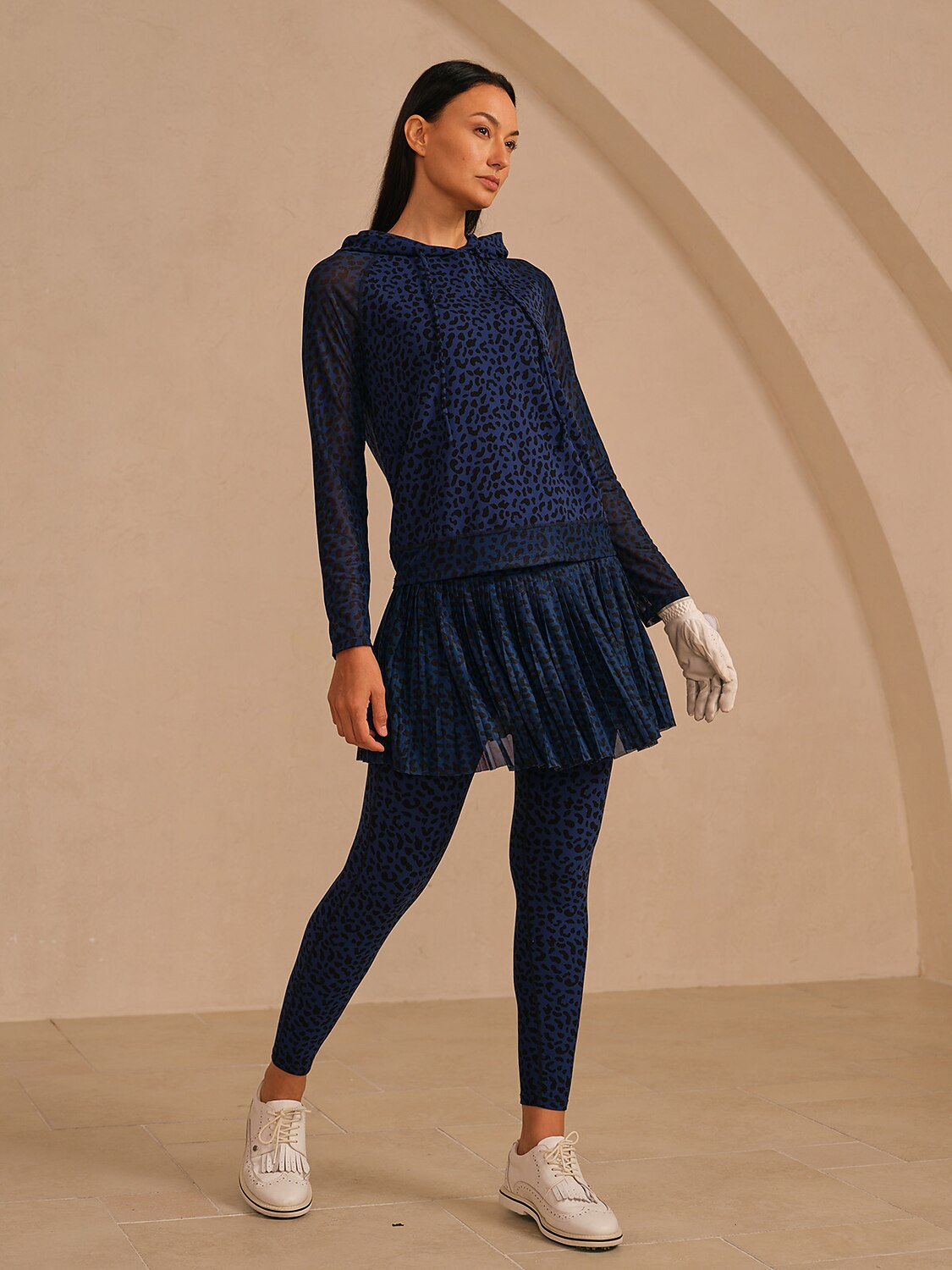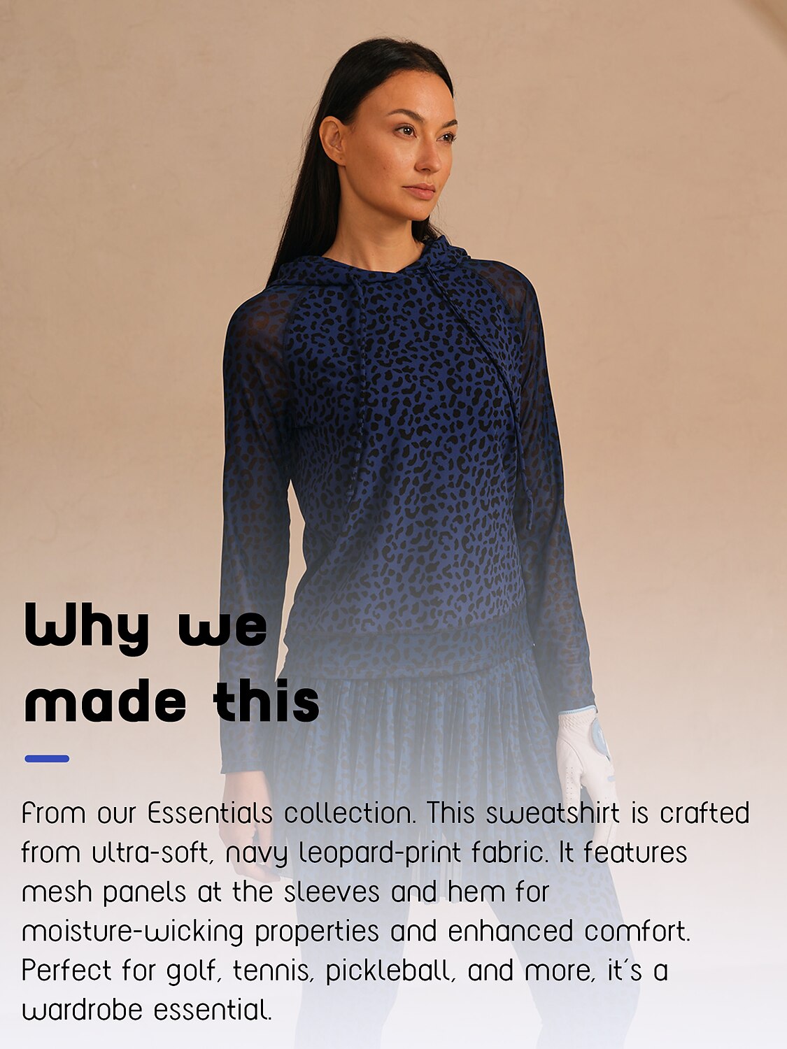 私たちのEssentialsコレクションから。このスウェットシャツは、超柔らかいネイビーのレオパード柄生地で作られています。袖と裾にはメッシュパネルが施されており、湿気を逃がし快適さを高めます。ゴルフ、テニス、ピックルボールなどに最適で、ワードローブの必需品です。