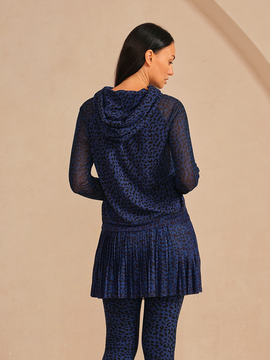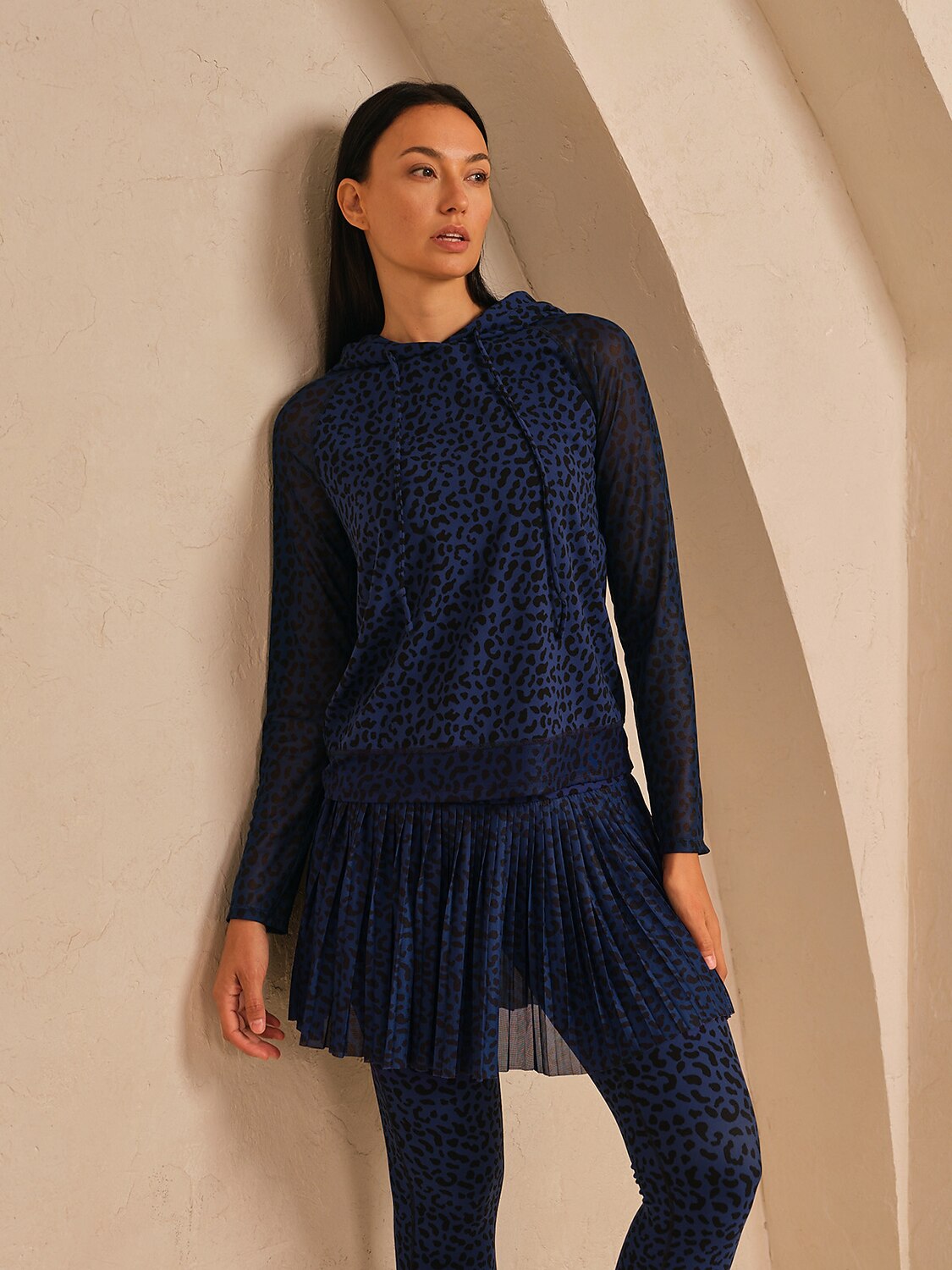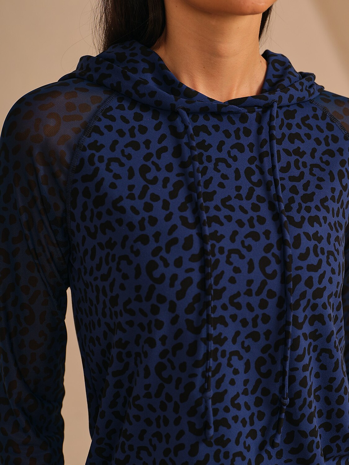 私たちのEssentialsコレクションから。このスウェットシャツは、超柔らかいネイビーのレオパード柄生地で作られています。袖と裾にはメッシュパネルが施されており、湿気を逃がし快適さを高めます。ゴルフ、テニス、ピックルボールなどに最適で、ワードローブの必需品です。