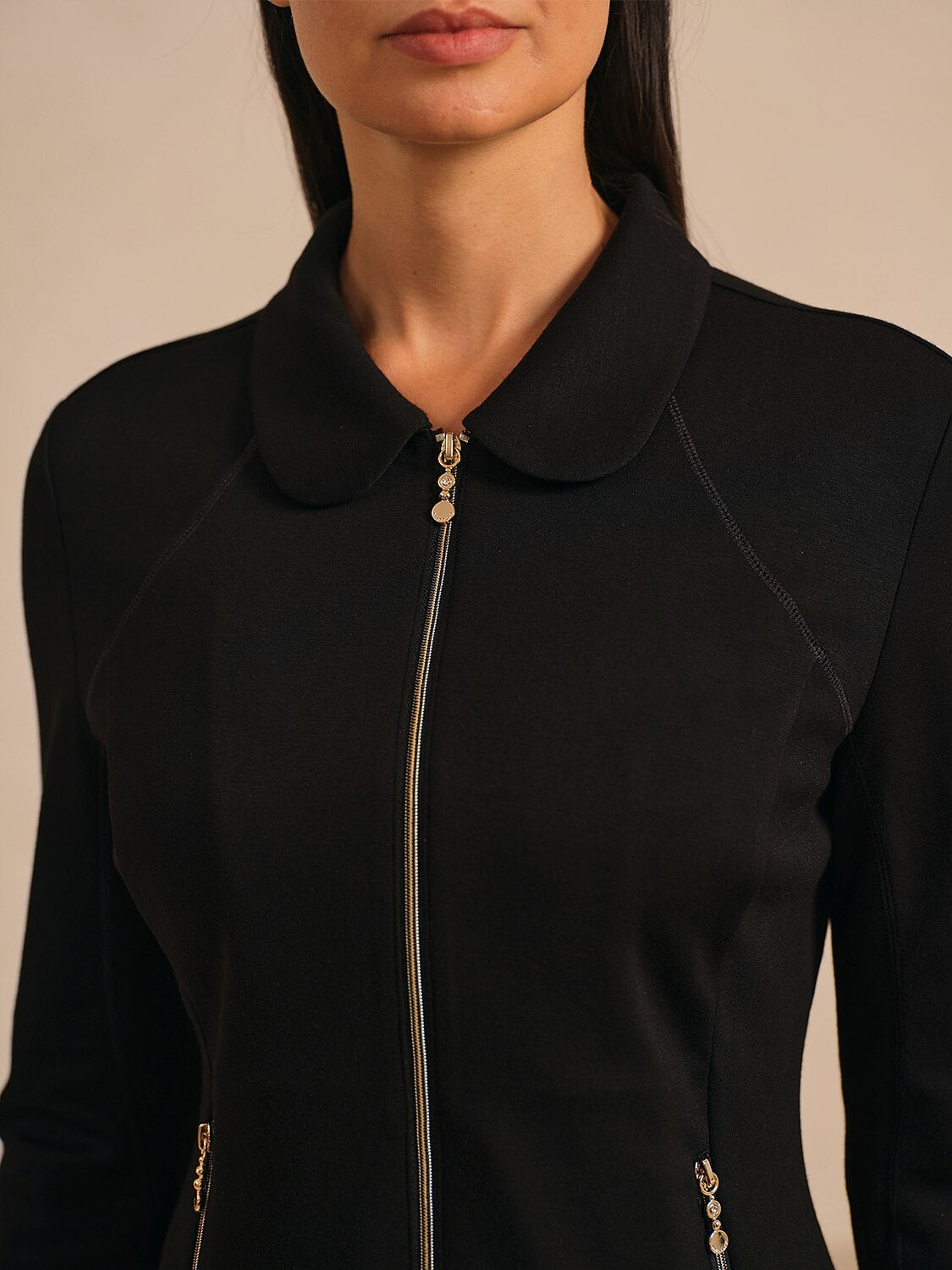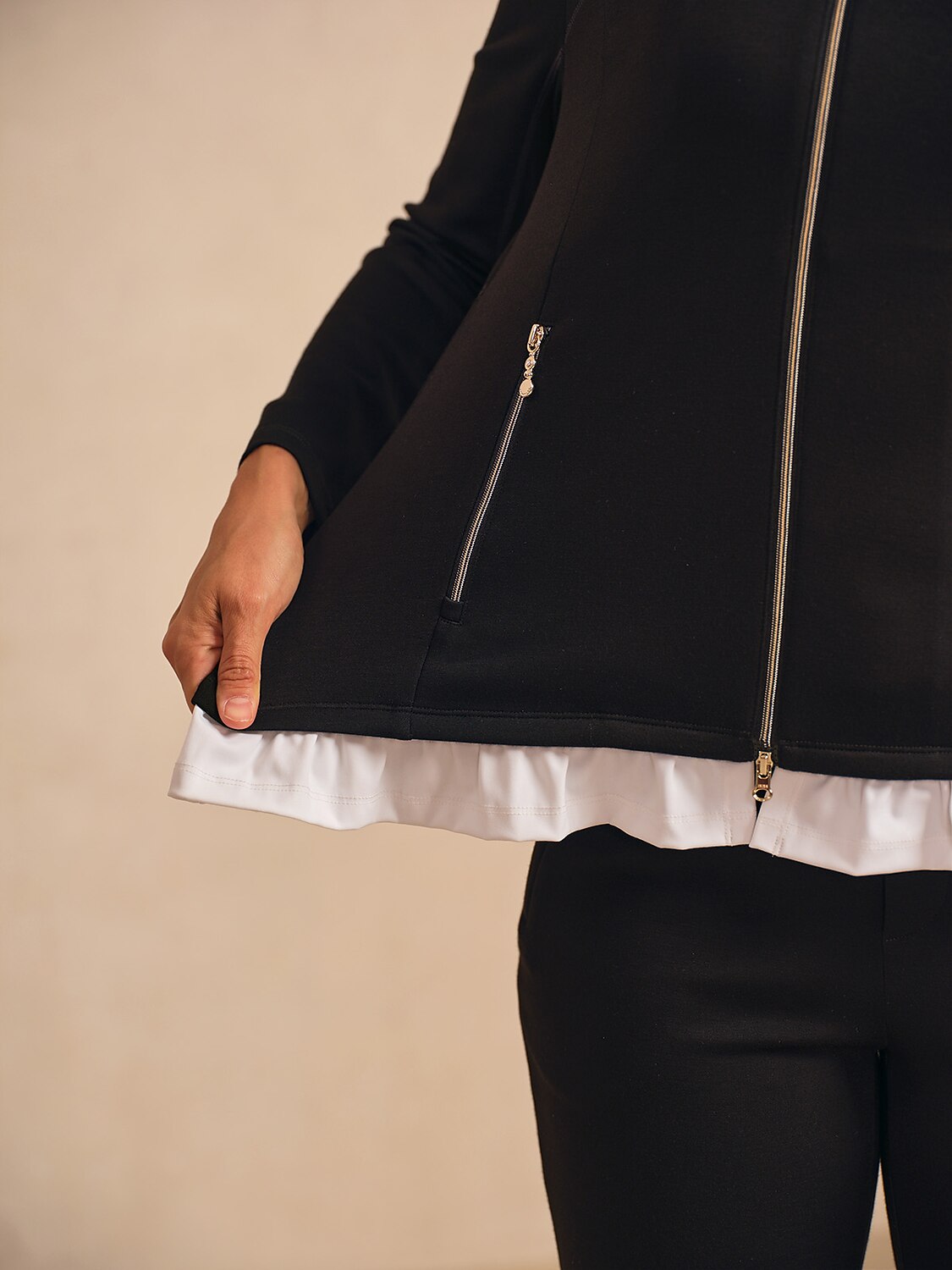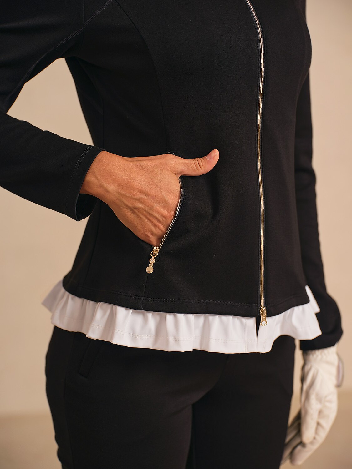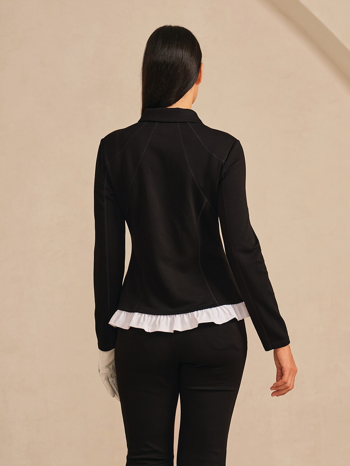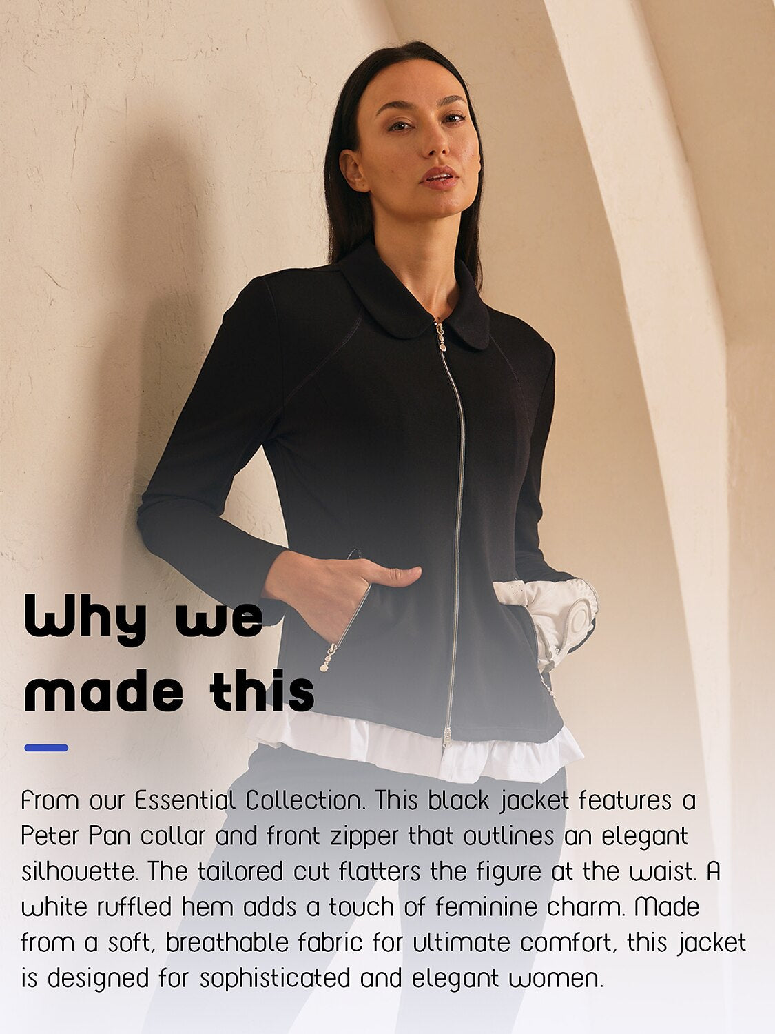 エッセンシャルコレクションから。こちらのブラックジャケットは、ピーターパンカラーと、エレガントなシルエットを際立たせるフルジッパーが特徴です。テーラードカットがウエストラインを美しく引き立てます。ホワイトのフリルヘムが女性らしい魅力をプラス。柔らかく通気性の良い生地で作られており、快適さを追求したこのジャケットは、洗練されたエレガントな女性のためのデザインです。