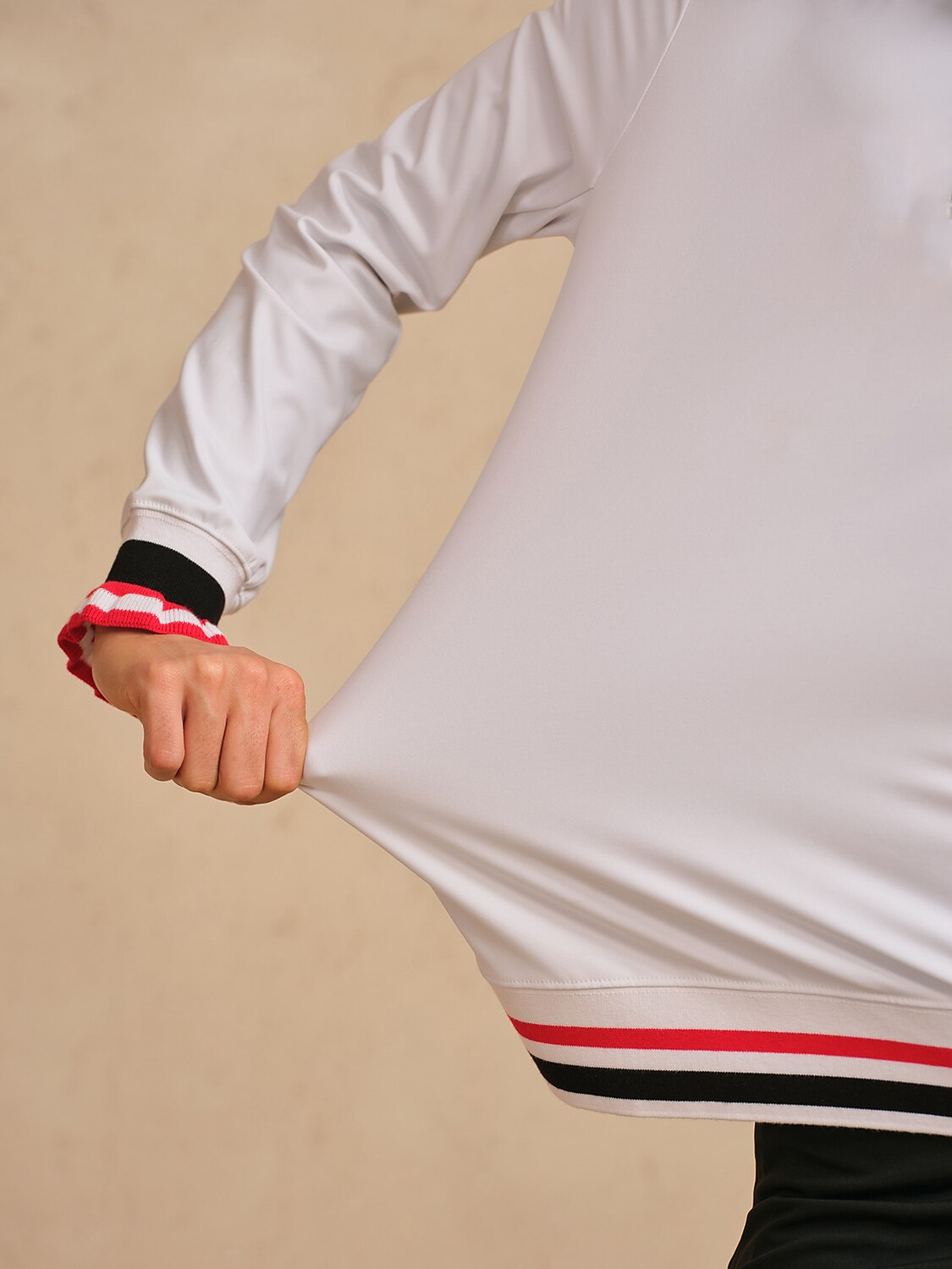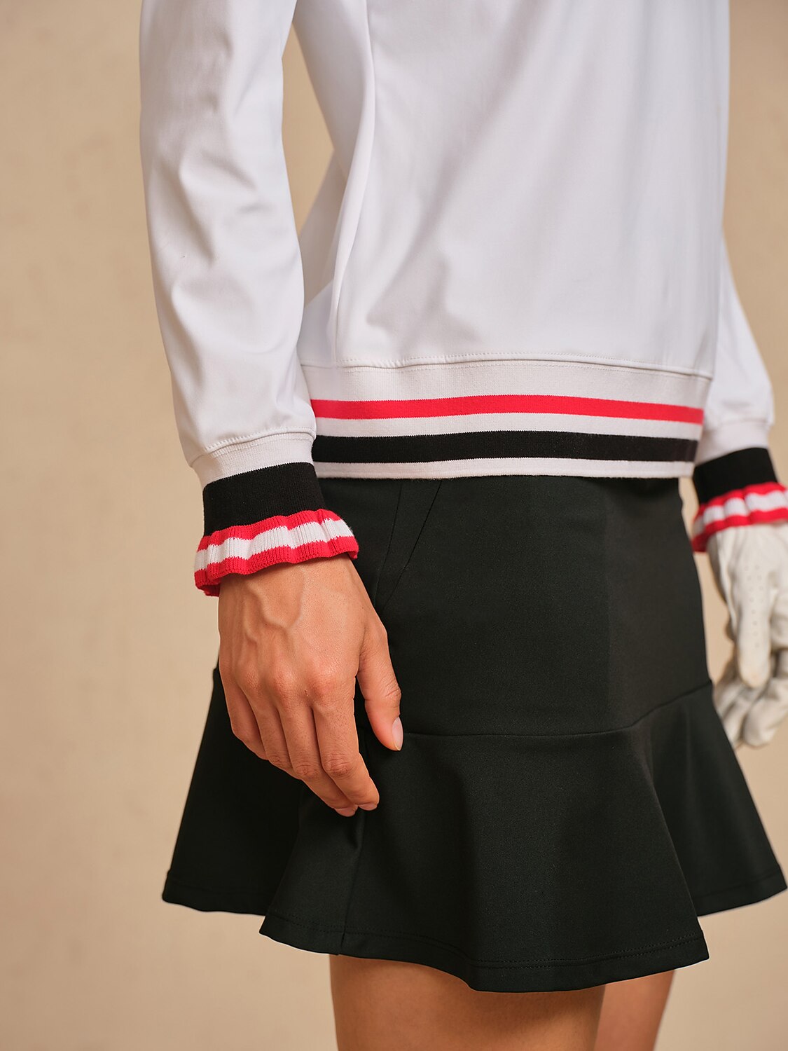 Navycoreコレクションから。このゴルフポロシャツは、フリル付きリブ襟デザインを中心に、繊細なディテールとスポーティな機能性を巧みに融合させています。カスタムの襟、カフス、裾のストライプリブが、フィット感と伸縮回復性を確保しつつ、視覚的な奥行きを高めます。純白のベースは爽やかなエレガンスを放ち、黒と赤のコントラストアクセントがモダンでスポーティなエネルギーを注入。テクニカルファブリックを使用し、スイングの自由な動きを妨げず、女性らしいデザイン言語とプロフェッショナルなゴルフパフォーマンスをシームレスに融合させています。