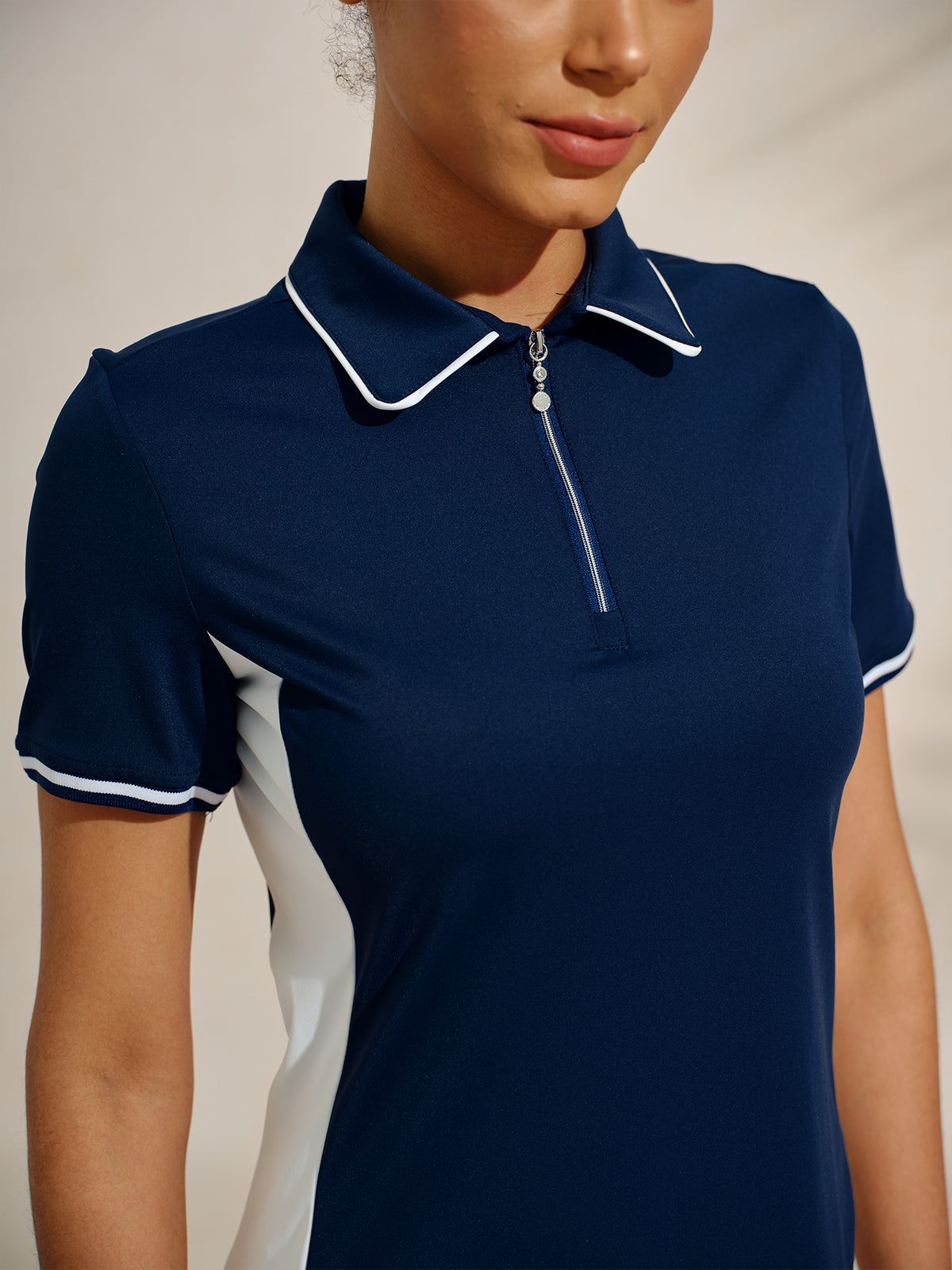 This golf dress is Performance meets style, designed with contrast colors and ribbed cuffs for sporty elegance. Forward-shifted shoulder seams enhance swing mobility, while curved side cuts create a flattering silhouette for effortless performance from tee to green.