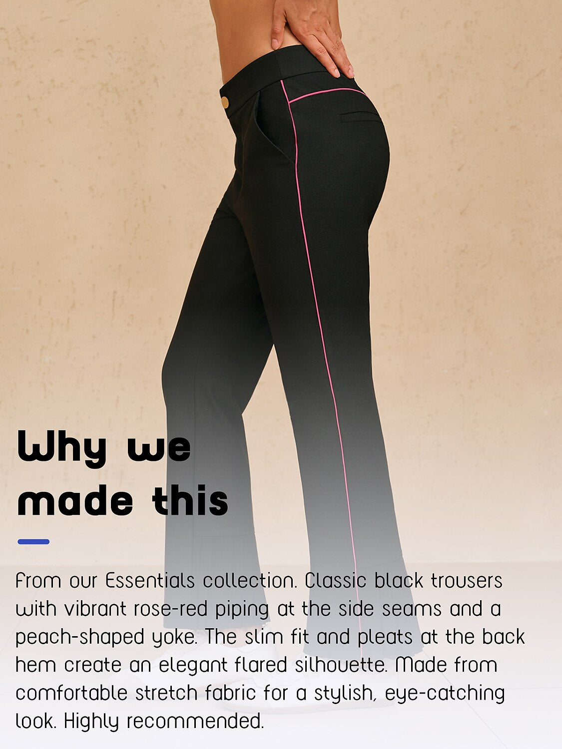 From our Essentials collection. Classic black trousers with vibrant rose-red trim at the side seams and a peach-shaped yoke. The slim fit and pleats at the back hem create an elegant flared silhouette. Made from comfortable stretch fabric for a stylish, eye-catching look. Highly recommended.