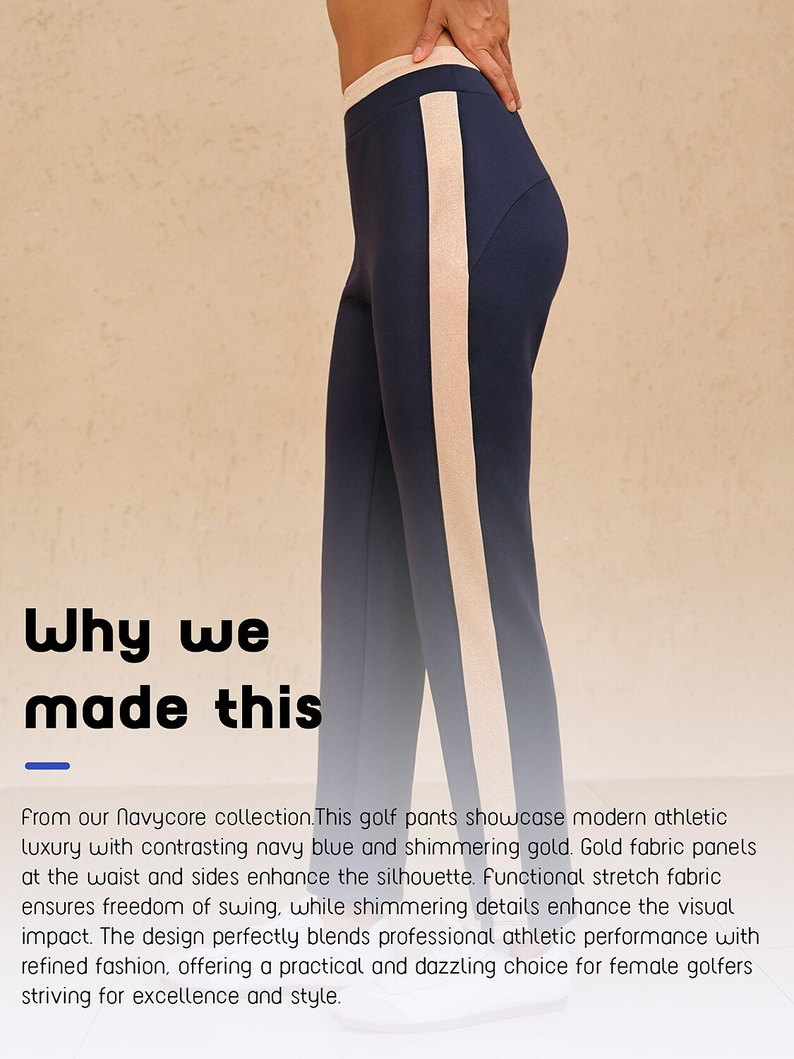 From our Navycore collection.This golf pants showcase modern athletic luxury with contrasting navy blue and shimmering gold. Gold fabric panels at the waist and sides enhance the silhouette. Functional stretch fabric ensures freedom of swing, while shimmering details enhance the visual impact. The design perfectly blends professional athletic performance with refined fashion, offering a practical and dazzling choice for female golfers striving for excellence and style.