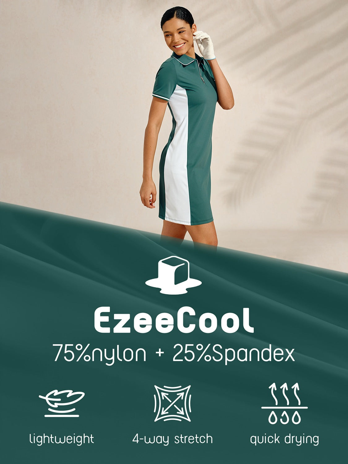 EzeeCool™ is a high-performance nylon fabric enhanced with spandex for ultimate ease and comfort. This self-cooling material resists wrinkles and is easy to care for, ensuring a crisp, neat look with minimal effort. Its cool, silky feel make it perfect for summer, wicking away moisture to keep you dry and refreshed for any activity.