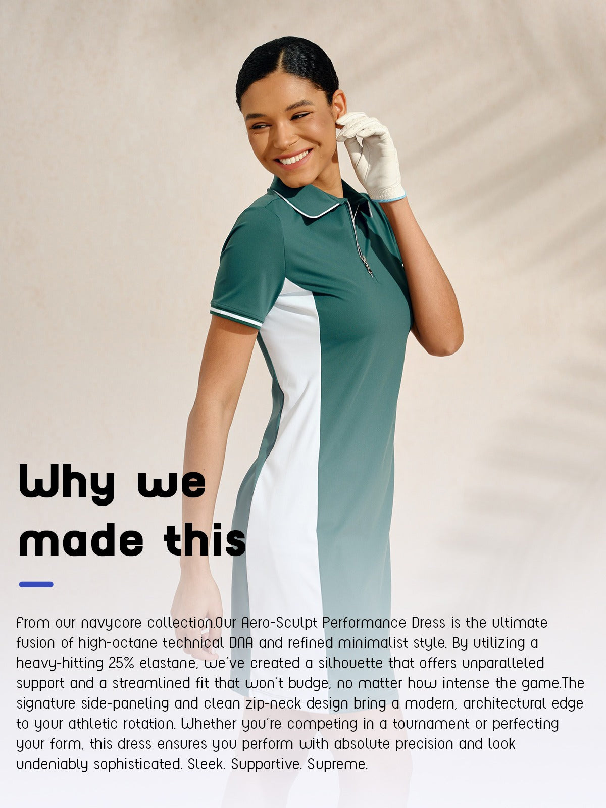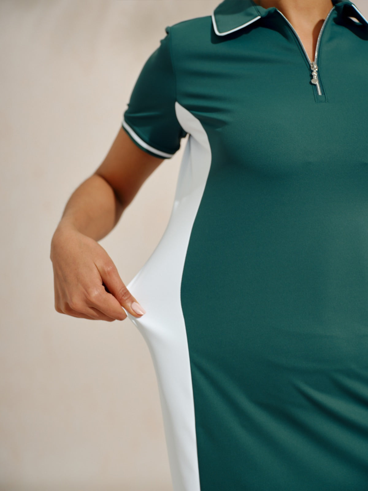 This golf dress is Performance meets style, designed with contrast colors and ribbed cuffs for sporty elegance. Forward-shifted shoulder seams enhance swing mobility, while curved side cuts create a flattering silhouette for effortless performance from tee to green.