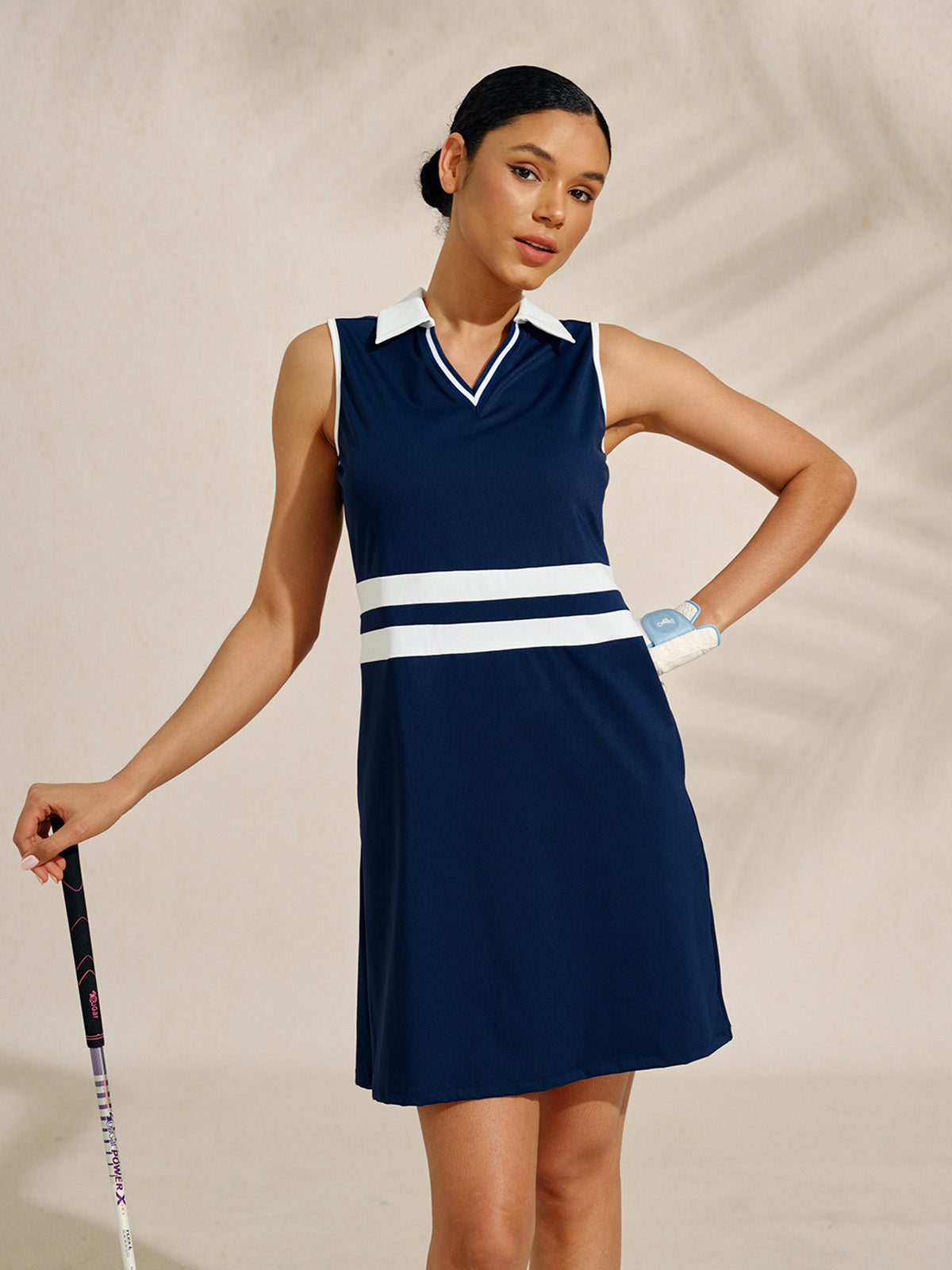 From our Navycore collection. This high-performance golf dress combines sporty functionality with modern design. Contrast lapels and a ribbed V-neck draw attention, while the contrast waistline elongates the figure for a flattering silhouette. Hidden pockets at the back add functionality.