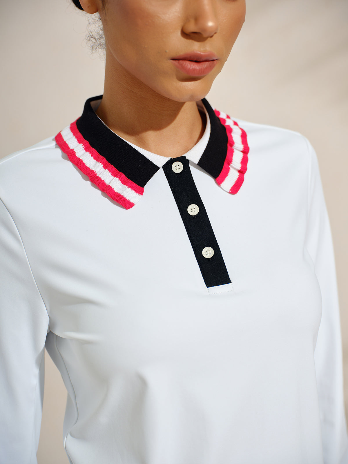 From our Navycore collection.This golf polo centers on a ruffled ribbed lapel design, skillfully blending delicate details with athletic functionality. The custom striped ribbing at the collar, cuffs and hem ensures a secure fit and stretch recovery while enhancing visual depth. A pure white base exudes fresh elegance, while black and red contrast accents inject modern sporty energy. Crafted with technical fabrics for unrestricted swing mobility, it seamlessly merges feminine design language with professional golf performance.