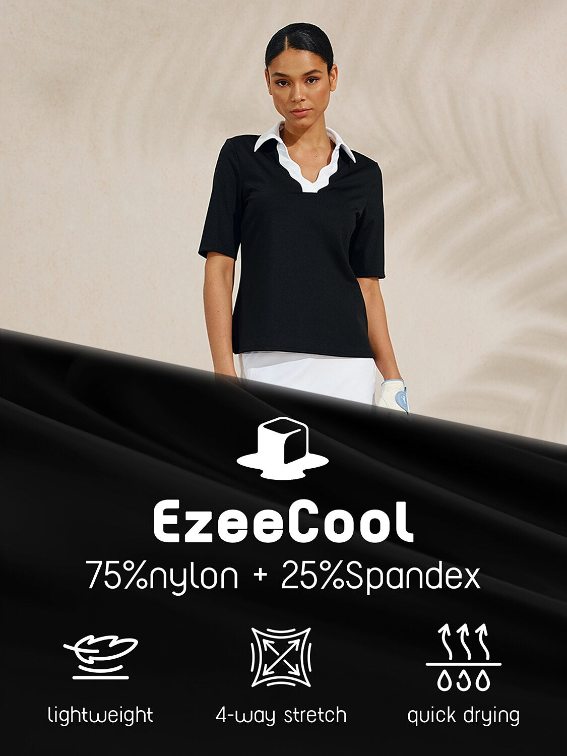 EzeeCool™ is a high-performance nylon fabric enhanced with spandex for ultimate ease and comfort. This self-cooling material resists wrinkles and is easy to care for, ensuring a crisp, neat look with minimal effort. Its cool, silky feel make it perfect for summer, wicking away moisture to keep you dry and refreshed for any activity.