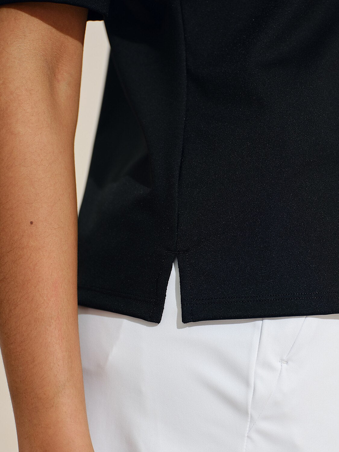 From our Essentials collection. This polo shirt features colorblock design and a petal-shaped V-neck. The side slit and stretchy fabric allow for ease of movement. With a classic half sleeve cut, it combines elegance and comfort for confidence on the golf course.
