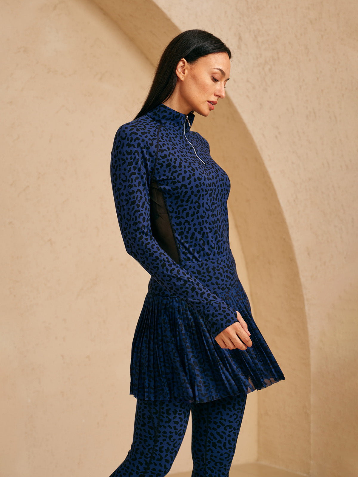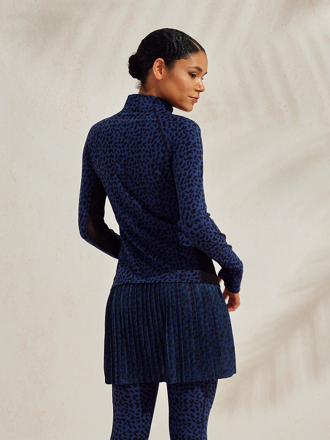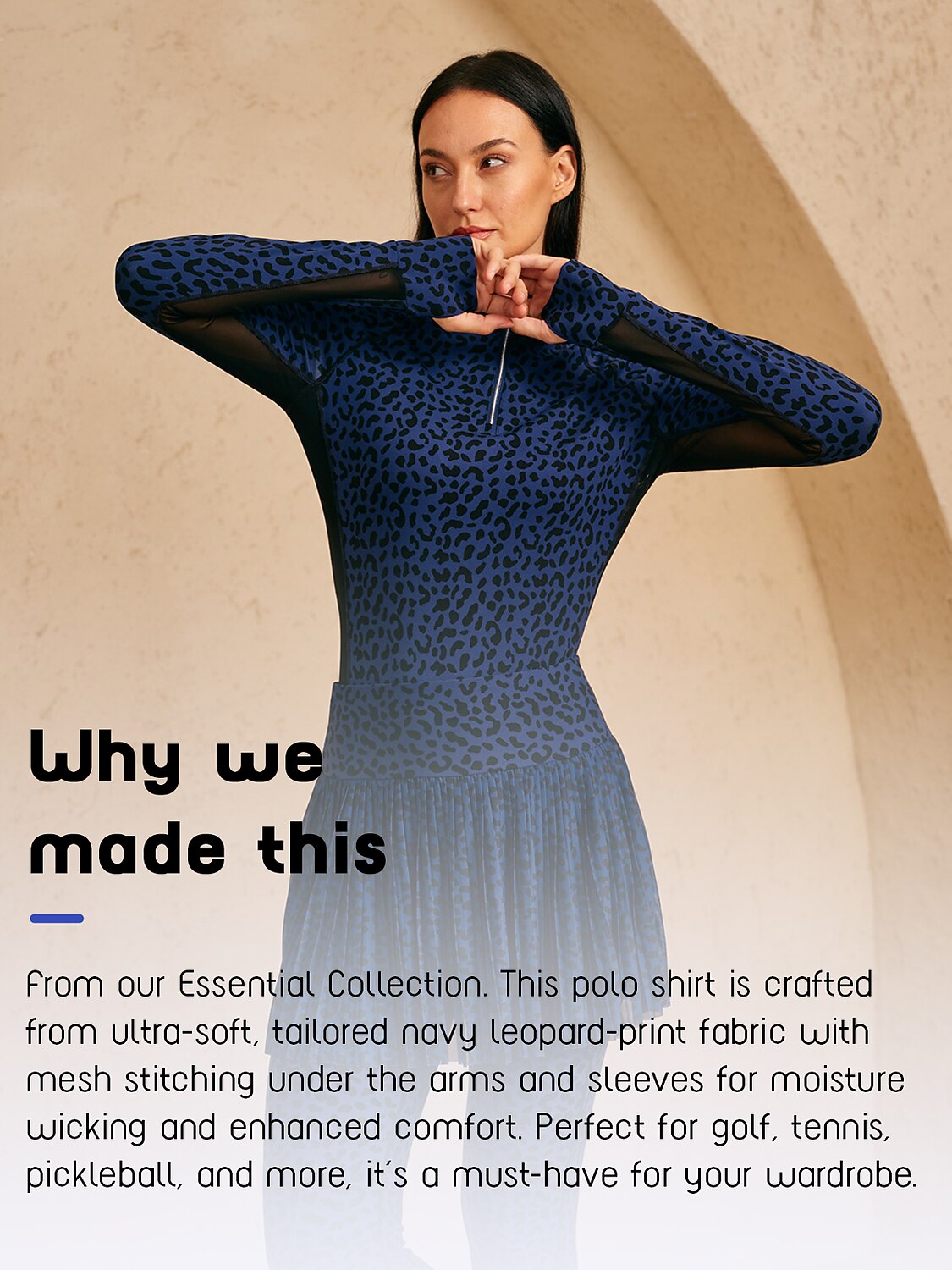 From our Essential Collection. This polo shirt is crafted from ultra-soft, tailored navy leopard-print fabric with mesh stitching underarm and sleeves for moisture wicking and enhanced comfort. Perfect for golf, tennis, pickleball, and more, it's a must-have for your wardrobe.
