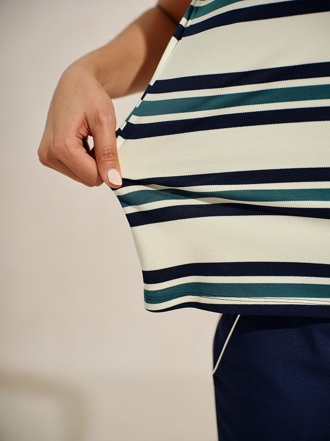From our navycore collection.Our Kinetic Stripe Performance Tank is designed for the golfer who respects tradition but lives for the modern edge. We’ve reimagined the classic striped polo with an asymmetrical twist that captures the energy of the game.Utilizing a high-performance 97% Polyester blend, this top is a powerhouse of durability and moisture management. It’s light, it’s airy, and it’s built to withstand the rigors of the sport while keeping you looking impeccably sharp. Whether you're navigating a challenging par-5 or enjoying a post-round drink at the clubhouse, this top ensures you stand out for all the right reasons. Bold. Breathable. Beyond the Ordinary.