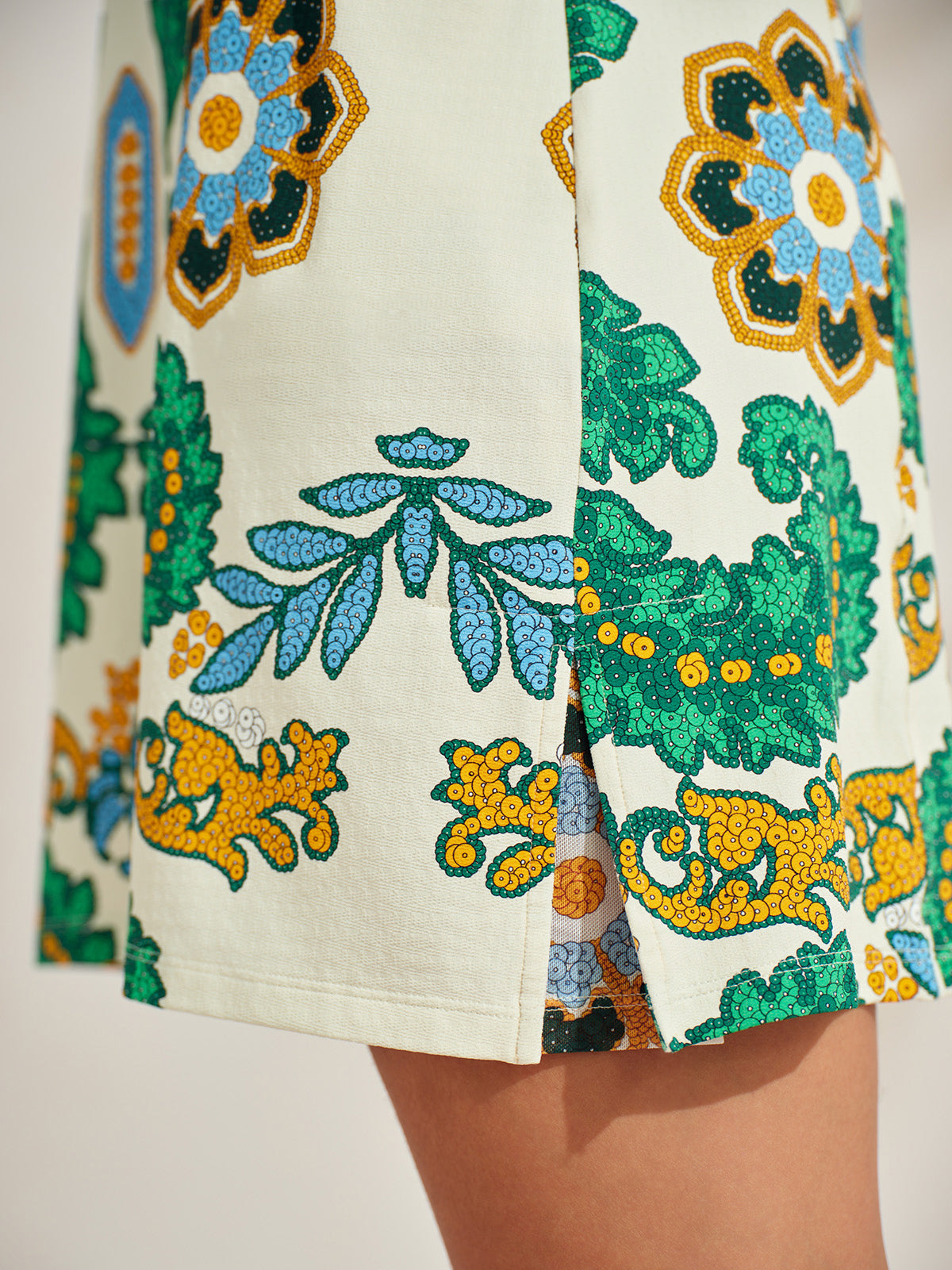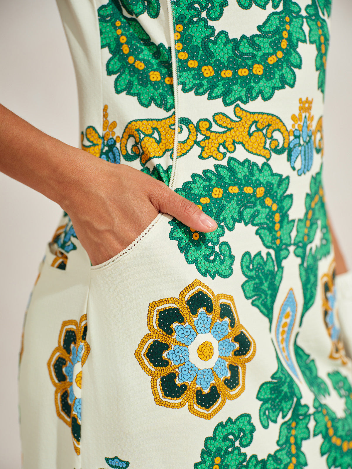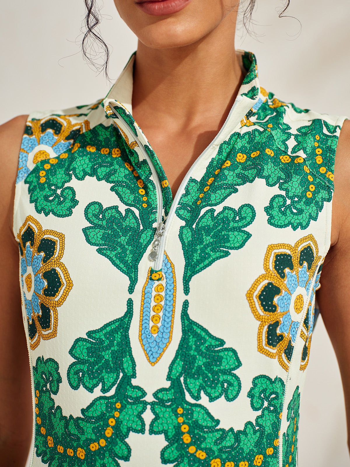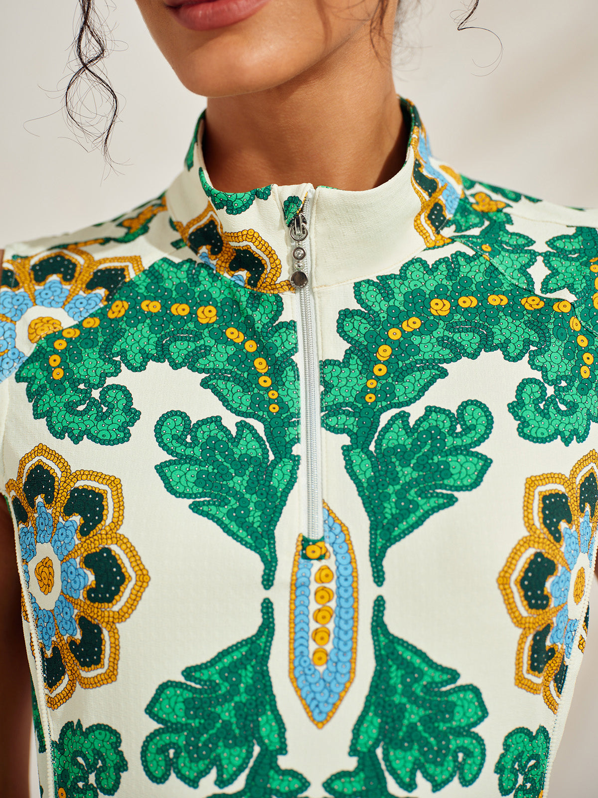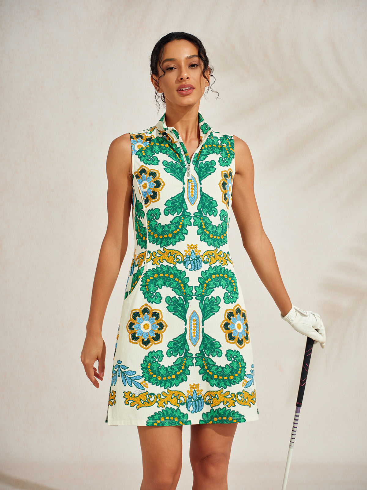 From our premium collection, made from our own developed Ezeecool™ fabric. The pattern design draws inspiration from sequins, artfully arranged into intricate floral patterns that blend colors and textures. This dress is designed with a diamond-embellished zipper with a skin-friendly zipper guard, curved seams, trim and mesh side slits flatter your figure, which is perfectly combined stylish and performance for a modern golf look.